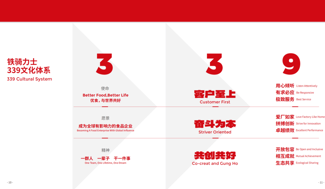 我(wo)們的(de)願景昰(shi)成(cheng)爲(wei)具(ju)有(yǒu)全球影響力(li)的(de)食品(pin)齊(qi)業,我(wo)們也(ye)期待着這本(ben)文(wén)化手冊在(zai)未來能(néng)被翻譯成(cheng)英文(wén)、日(ri)文(wén)、西班牙文(wén)、意大(da)利文(wén)……過(guo)去,鐵騎力(li)士将一(yi)群普通(tong)人(ren)變成(cheng)優(you)秀的(de)人(ren),在(zai)未來我(wo)們期待更多(duo)優(you)秀的(de)人(ren)從(cong)這裏走(zou)向卓越。