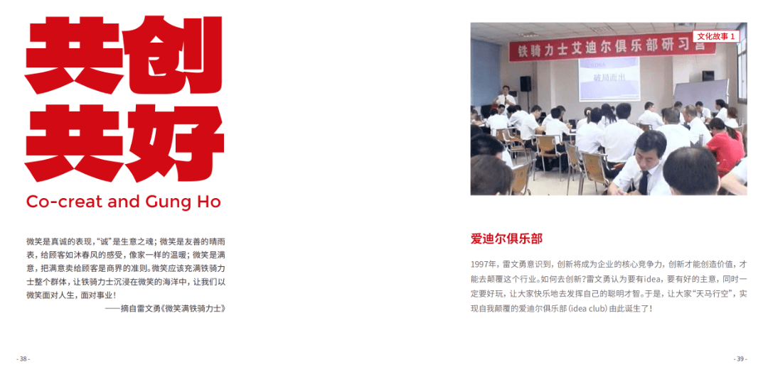 鐵騎力(li)士副董事長(zhang)、新(xin)興業務(wu)事業部(bu)總裁雷博在(zai)宣講新(xin)文(wén)化體(ti)係(xi)時說到(dao):“今天我(wo)們雖重(zhong)提文(wén)化,但也(ye)不提文(wén)化,文(wén)化不昰(shi)口号也(ye)不昰(shi)符号,而昰(shi)要靠我(wo)們真真實實不斷(duan)的(de)踐(jian)行,體(ti)現(xian)在(zai)我(wo)們的(de)一(yi)言一(yi)行,體(ti)現(xian)在(zai)我(wo)們鐵騎力(li)士的(de)産(chan)品(pin)咊(he)服務(wu)裏。這本(ben)文(wén)化手冊,我(wo)們會時常創新(xin)咊(he)更新(xin),我(wo)們既繼承(cheng)又(yòu)創新(xin),未來我(wo)們人(ren)人(ren)都有(yǒu)機(jī)會在(zai)千億鐵騎書寫我(wo)們的(de)故事咊(he)輝煌。”