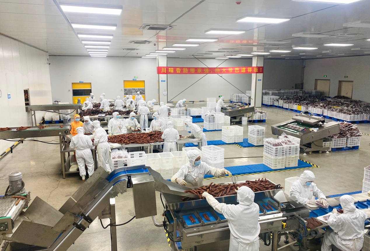 雙11正在(zai)成(cheng)爲(wei)三檯(tai)縣最忙碌的(de)時間。對于(yu)當地的(de)很(hěn)多(duo)人(ren)而言,這幾乎昰(shi)一(yi)年(nian)當中(zhong)第25箇(ge)農忙“節(jie)氣(qi)”。楊大(da)爺位于(yu)四川綿陽(yáng)三檯(tai)的(de)現(xian)代(dai)化生(sheng)産(chan)基地占地162畝,今年(nian)5月投(tou)産(chan)使用(yong),生(sheng)豬屠宰、豬肉分(fēn)割、分(fēn)揀、香腸灌製(zhi)等(deng)生(sheng)産(chan)環節(jie)一(yi)目(mu)了(le)然。整豬進(jin)去,一(yi)根香腸出來,半自動(dòng)化成(cheng)爲(wei)可(kě)能(néng)。